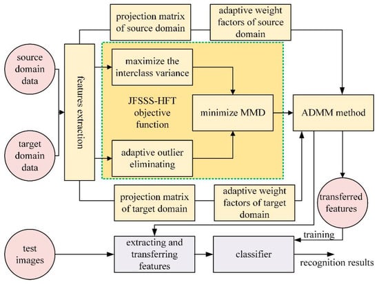 As shown in Figure 1, the objective function of JFSSS-HFT contains three terms, i.e., maximizing the interclass variance term and the adaptive outlier eliminating term, and minimizing the MMD term. In addition, the main variables of JFSSS-HFT to be optimized include two projection matrices with different sizes that are used for mapping the input features from the source domain and the target domain and two adaptive weight factors of the source domain and the target domain that are used to evaluate the importance of each sample for transfer. Furthermore, to obtain the optimal variables of JFSSS-HFT, the ADMM method is constructed to solve the optimization problem of JFSSS-HFT. Based on the optimization solution, the mapped features from the different domains are considered the transferred results and can be used to train the classifier. Given a test image with a high resolution, the corresponding features are extracted and mapped into the common space, and then its class label can be predicted using the trained classifier.