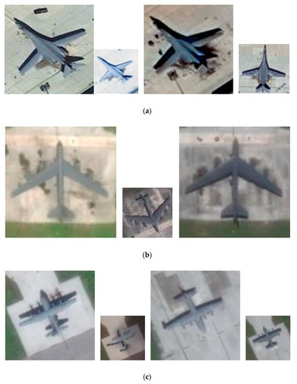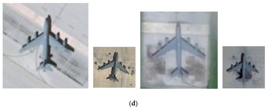 Dataset (1) comprises four types of airplanes patches with different resolutions collected from the Google Earth service. Among them, 120 airplane patches with 0.5-m spatial resolution are regarded as samples from the target domain, and 200 airplane patches with 1-m spatial resolution are considered as samples from the source domain. Since these patches are acquired by different illumination conditions and contain airplanes with different orientations and different backgrounds, it can verify the performance of the proposed JFSSS-HFT for object classification using RSIs. The representative samples in dataset 1 are displayed in Figure 2.