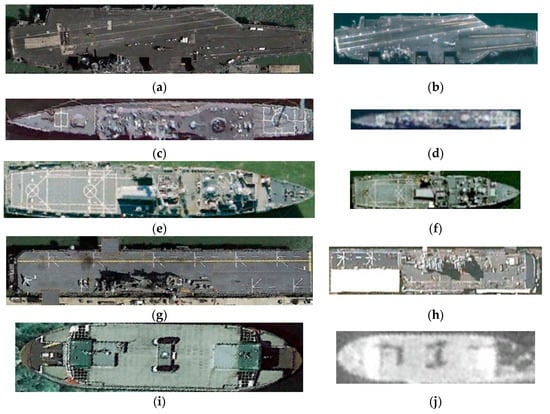 Dataset (2) contains five types of ship patches with different resolutions collected from the HRSC-2016 publicly available dataset [24], where 120 ship patches with a 1.07 m spatial resolution are regarded as the target domain, and the 200 ship patches with a lower spatial resolution are considered as the source domain. Since these ship patches are observed under different illumination conditions, different ships present different sizes of occlusion due to their superstructure. The representative ship patches are displayed in Figure 3.