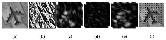 Multiple feature visualization results for airplane patch, where (a) denotes the original patch. The local binary pattern features (LBP) are displayed in (b). (c–e) denote the Gabor feature using Gabor filter with different orientations and scales, and (f) denotes the HoG feature.