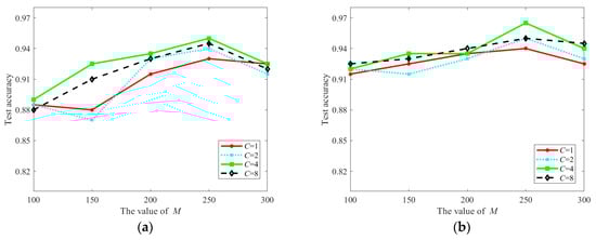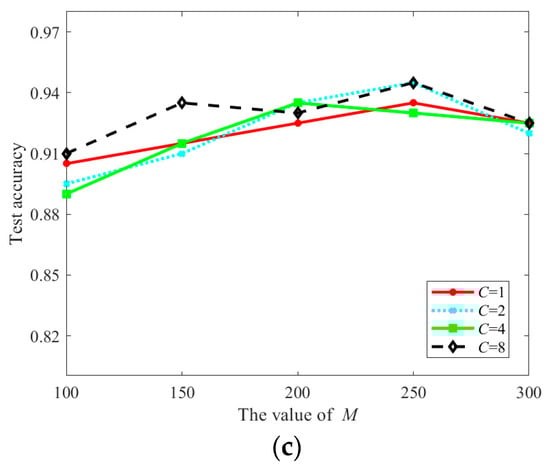 As can be seen from Figure 6, different classification results are obtained under different parameter settings. In detail, it is seen that the classification accuracy first improved and then decreased with the increase in M. The reason is that with the increase in dimensions for the transferred features, they will contain more information. Nevertheless, if the dimensions of features are too large, the transferred features may contain noise data. In addition, it was observed that the classification accuracy with C = 4 is obviously higher than the classification accuracy with the other values of C. Since the parameters and can be used to determine the rate of the outliers for samples, it is noted that the and with proper values (e.g., and ) can be used to improve the classification results. In contrast, overly large parameters will lead to the removal of high-quality samples and therefore weaken the classification results, e.g., and . Moreover, it is noted that the best results are obtained under M = 250, C = 4, , and .