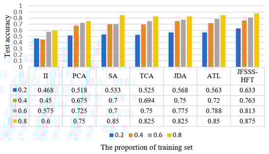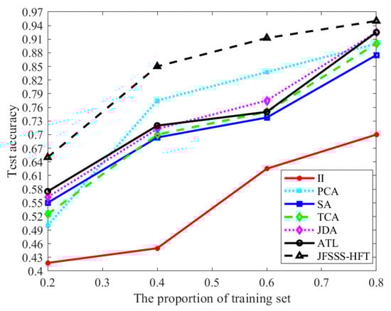 To evaluate the performance of the JFSSS-HFT compared with typical feature transfer methods, including principal component analysis (PCA) [29], transfer component analysis (TCA) [12], Subspace Alignment (SA) [30], joint probability adaptation (JDA) [13], and active transfer learning (ATL) [18], different proportions of samples in the target domain of dataset 1 together with samples in the source domain of dataset 1 are used as the training set and the remaining samples in the target domain of dataset 1 are used as the test set to obtain the classification results of different feature transfer methods. The image interpolation (II) method (i.e., bilinear interpolation) [31] can be considered a special feature transfer method to transform the image patches from the source domain to the same size of image patches from the target domain. Therefore, in addition to the above feature transfer methods, we also use the image interpolation method to process the samples and then train the classifier. All feature extractors described in Section 4.1 are used to extract the features of the input image, and the obtained features are then used to examine the performance of different feature transfer methods. To make a fair comparison, the dimension of transferred features for all methods is set to 250. In addition, all methods select the optimal parameter to obtain the final classification results. The obtained results are shown in Figure 7.