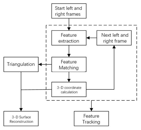 Three-dimensional surface reconstruction and feature tracking are the main contents of this paper. Its purpose is to use the feature matching information in two images to restore the visual three-dimensional shape of the object surface and track the feature points in the image [12]. Combining feature extraction method and feature matching method, 3D surface reconstruction is realized by matching feature points in the frame, calculating 3D coordinates of feature points, and triangulating discrete feature points on matching results; feature tracking is realized by calculating the position of the same feature point in different frames, and the calculation process is shown in Figure 1.
