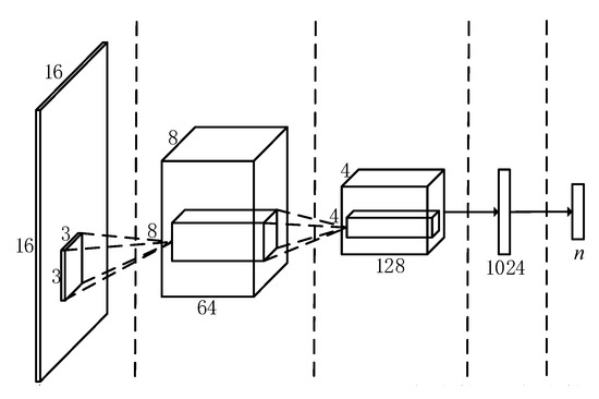 The entire convolutional neural network contains a total of 4 layers, the first two layers are convolutional layers, and the last two layers are fully connected layers. Among them, the first layer of convolution layer contains 64 convolution kernels, and the second layer contains 128 convolution kernels. The first layer of the fully connected layer contains 1024 nodes. To make the network adapt to different data training, the number of nodes in the second layer of fully connected layer corresponds to the number of feature point categories n. At the same time, the output of the last fully connected layer is sent to a Softmax transmission layer with n outputs to generate a probability distribution over n categories. The input image will be classified into the category with the highest probability, and the feature point classification is realized. To reduce network parameters and speed up training, each layer of convolutional layer is followed by a filter with a maximum pooling layer with a size of 2 × 2 pixels. To avoid gradient saturation during the network training process, all convolutional layers and fully connected layers use ReLU with relatively stable performance as the activation function. To reduce over-fitting, Dropout is introduced in the first fully connected layer.