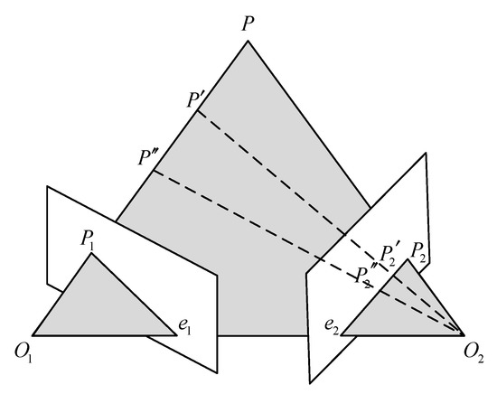 Polar geometry is used to describe the geometric relationship between the images of the same object in three-dimensional space from different perspectives at the same time. The relationship is only related to the parameters of the camera and the relative attitude of the two images. A typical binocular imaging system is shown in Figure 3, where and represent the origin of the coordinate system of the left and right cameras, is a point in three-dimensional space, and and are the positions of on the imaging plane of the two cameras. The distance between the origin of the two camera coordinate systems, that is, the line between and , is called the baseline. The intersection of the two imaging planes and the baseline is called several points, which are represented by and , respectively.