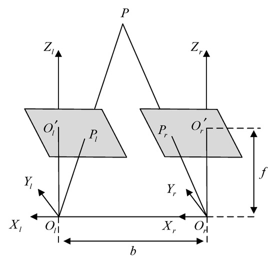 and in Figure 5 represent the optical centers of left and right cameras respectively. The length of and lines is , and the focal length of both cameras is . The coordinates of a point in three-dimensional space on two camera imaging planes are represented by and , respectively, and the coordinate of in the left camera coordinate system is . Furthermore, since the imaging point has no parallax in the -axial direction, can be obtained by the similar triangle principle (4).