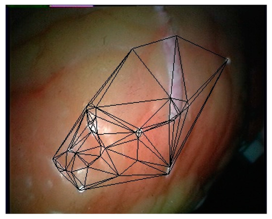 Firstly, the training data are generated from the first 200 frames of the left video of the endoscope to train the convolutional neural network. Then, the left and right images used for 3D curved surface reconstruction are matched with the model. Finally, the Delaunay triangulation of the feature points is performed using the plane projection method. To facilitate the calculation, the imaging plane of the image is taken as the projection plane, and the segmentation result on the left image is taken as the segmentation result of this frame. The triangulation result of the feature points in the left image on frame 201 is shown in Figure 11.