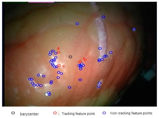 In this experiment, the number of feature points used in the initial frame of the endoscope video is 52. According to this method, the feature tracking experiment is carried out. Because of the large number of feature points tracked, and the fact that most of the feature points have similar motion, it is not necessary to display the tracking results of all feature points. In this paper, some of the feature points that are best able to represent the overall regional change are selected to display the results. Firstly, the centroids of all kinds of feature points on the starting frame are calculated, and then the three feature points closest to the centroid are selected as the tracking points of this experiment, and they are marked as a, b and c, as shown in Figure 14.