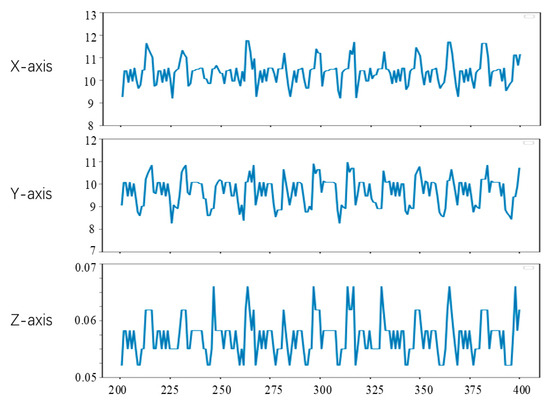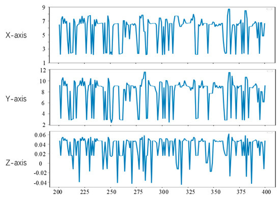 Since the first 200 frames of the left video have been used to generate the training data of the convolutional neural network in the experiment, the feature tracking experiment in this section is carried out on the videos of frames 201 to 400. To observe the position changes of the feature points, we set the position of feature points in the lost tracking frame as the mean value of the position of the feature points in two adjacent frames. The tracking results of feature points a, b and c are shown in Figure 15, Figure 16 and Figure 17, respectively. The horizontal axis coordinate is the tracking frame number, and the vertical axis unit is millimeter.