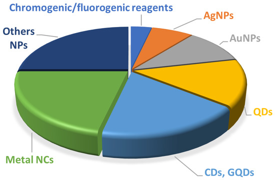 Figure 2. Percentage of publications related to the application of PADs with different recognition elements for sensing Hg(II) in water using colorimetry and luminescence. AgNPs, silver nanoparticles; AuNPs, gold nanoparticles; CDs, carbon dots; GQDs, graphene quantum dots; NCs, nanoclusters; NPs, nanoparticles; QDs, quantum dots.