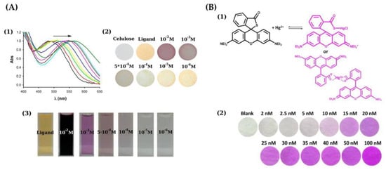 Figure 3. (A) (1) Normalized reflectance UV-Vis spectra of Hg(II) in acetonitrile upon dipping cellulose papers into solutions containing increasing concentrations; a bis(ferrocenyl) azine was used as chromogenic reagent; (2) naked-eye detection of Hg(II) using the paper-based sensor; (3) color of acetonitrile-water solutions of the chemosensor in the presence of Hg(II) at different concentration [42]. (B) (1) Reaction between rhodamine B thiolactone and Hg(II) to yield a purple red product; (2) paper-based sensors for Hg(II) showing the change from white to a purple-red color; a 10 nM Hg concentration can be detected with the naked eye [43]. Reproduced with permission of Elsevier [43].