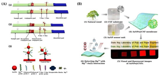 Figure 4. (A) (1) Scheme showing the fundamentals of sensing based on traditional lateral flow strips; (2) fundamentals of sensing based on signal amplified lateral flow strip; (3) detection of Hg(II) following specific recognition of T-rich ssDNA probes against Hg2+ resulting in the highly stable T–Hg2+–T complex [60]. (B) Scheme showing the design and sensing principle of cellulose nanofibrillated matrix-support gold nanoparticle membrane (AuNPs@CNF). (1) Starting material of natural wood. (2) CNF aqueous suspension. Inset: AFM of CNF. (3) AuNP aqueous dispersion. Inset: AFM of AuNPs. (4) Transparent AuNPs@CNF membrane. Inset: Internal microstructure of the membrane. (5) Visual images under room white light (top) and fluorescent images under UV light (bottom) of the membranes. (6) Detection of Hg2+ according to Hg2+-Au(I) interaction mechanism [62]. Figure 4A,B is reproduced with permission of Elsevier [60,62].