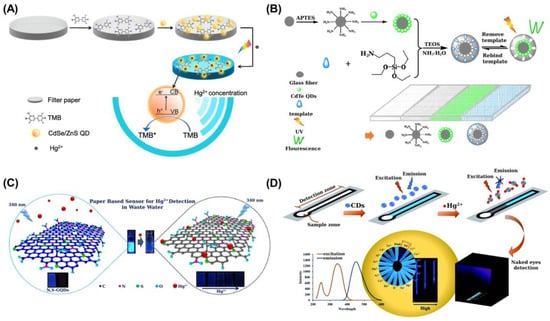 Figure 6. (A) Scheme of PAD based on the enhanced photocatalytic activity displayed by CdSe/ZnS QDs on TMB oxidation under visible light in the presence of Hg(II) [78]; (B) preparation of an ion-imprinted polymer and grafting onto glass fiber paper to build a 3D origami μ-PAD (Paper@QDs@IIP) [80]; (C) scheme showing the detection of Hg(II) based on turn-off fluorescence of N,S-GQDs; the N atoms enhance the fluorescence quantum yield while S atoms serve as the active sites for Hg(II) coordination [81]; (D) distance-based micro-PAD for the detection of Hg(II) using nitrogen-doped CDs as fluorescent probes [85]. Figure 6A-D is reproduced with permission of Elsevier [78,80,81] and the Royal Society of Chemistry [85].