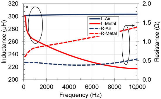 Figure 2 shows measured results of inductance, L, and resistance, Rs, of the designed coil in two different scenarios: when the coil is located on top of a nonmetallic surface (L,R-Air), and when it is located on top of a 1 mm-thick aluminum plate (L,R-Metal). Measurements were made in the frequency range from 500 Hz to 10 kHz using a passive component LCR meter (LCR200 from Extech). For the case when the coil is located on top of a nonmetallic surface, inductance and resistance remain fairly constant with respect to frequency, and . On the contrary, when the coil is located on top of the metal plate, inductance decreases () with frequency due to the induced opposite current on the plate that cancels the current from the coil [20]. Likewise, the resistance increases () because the induced current on the plate contributes to the total resistance of the coil.