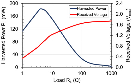 The miniature coil was designed to have an input resistance of a few ohms that will allow efficient rectification and matching while providing high harvested power [22]. Figure 4 shows the circuit diagram used for measuring harvested power. Parallel capacitors, , are used to resonate the system at 2 kHz to maximize power transfer [23]. Load was varied in the range 1 Ω–1 kΩ to find an optimal value. Figure 5 shows measured results of harvested power and received voltage for different loads. The optimal load is 4 Ω and harvests 180 mW with 8.5 W of input power. As load rises, the received voltage increases while the harvested power decreases. At a 4 Ω load, the harvested power peaks at 180 mW, while the received voltage is 850 mVrms, which should be high enough to achieve rectifier efficiencies between 45–62% [24]. The 4 Ω load provides an optimal impedance match at the output of the receiving coil.
