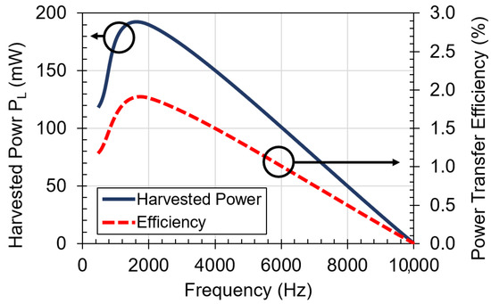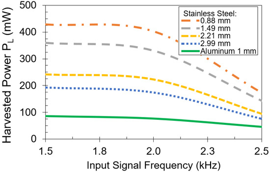 Figure 11 describes the measured harvested power with respect to frequency at an input power of 3 W for stainless steel. In this experiment, the frequency of the input signal is swept from 1.5 kHz to 2.5 kHz while load and parallel capacitances and are fixed at . The results indicate that harvested power starts to decrease above 2 kHz due to the skin effect of the metal plate. In addition, above 2 kHz, the circuit in Figure 4 is no longer operating at resonance. To achieve maximum harvested power, the resonance principle should be maintained [32].