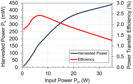Figure 7 shows the measured harvested power and power transfer efficiency versus input power at the optimal frequency of 2 kHz. The coil is designed to handle up to 35 W input power at the transmitting side so that the receiver coil can harvest up to 440 mW. The power transfer efficiency varies from 2.5% to a minimum of 1.2% at the highest input power of 35 W. The input power limit of 35 W is related to the maximum current and temperature ratings of 24 AWG wires from the manufacture datasheet [25,26]. At 35 W input power, the measured temperature of the coil temperature using a thermocouple is 110 °C, which is below the rated operating temperature of 200 °C for 24 AWG wires specified by the manufacturer. The coil is separated 0.5 mm away from the metal plate at each side of the barrier.