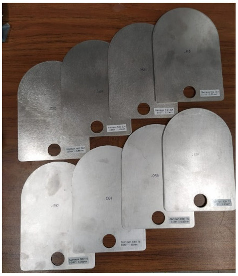 This section includes the performance of the coil, in terms of harvested power and power transfer efficiency, for different types of materials, thicknesses and frequencies. Figure 8 shows a picture of the different plates used in the experiments. Two types of alloys are used: stainless steel (AISI 304) and aluminum (6061T6). Different thicknesses of each of the plates are summarized in Table 3. In these experiments, we place one coil on each side of a plate to form an inductive link as shown in Figure 4.