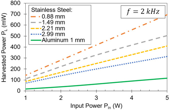 Harvested power versus input power using stainless steel plates of different thickness. Operating frequency is 2 kHz.