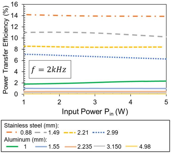 Power transfer efficiency versus input power using stainless steel and aluminum plates of different thickness. Operating frequency is 2 kHz.