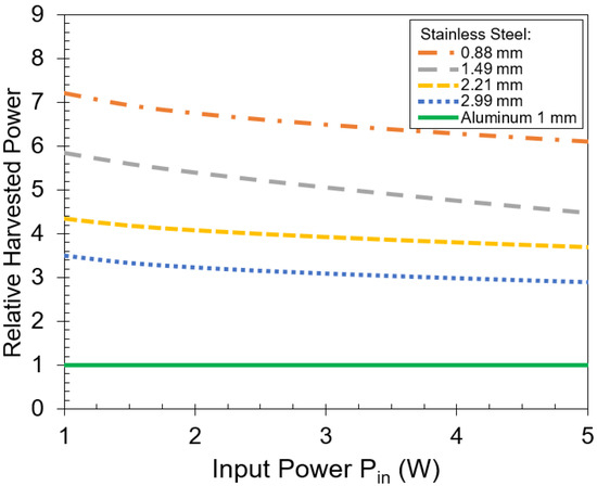 Figure 12 compares the harvested power through different stainless steel plates relative to the 1 mm-thick aluminum. The harvested power through a 2.99 mm-thick stainless steel plate is three times more than through a 1 mm-thick aluminum. As the thickness of the stainless steel plate decreases to 0.88 mm, the harvested power increases 7 times more than that through 1 mm-thick aluminum.