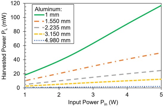 Harvested power versus input power using aluminum plates of different thickness. The frequency is 2 kHz.