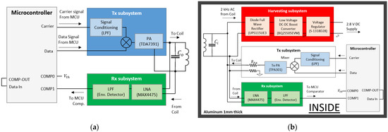 The inside subsystem is made of a harvesting subsystem, Tx subsystem, Rx subsystem and microcontroller ATtiny104 Xplained Nano from Microchip Technology. Communication is based on amplitude shift keying (ASK) modulation due to its simplicity for wireless data transfer through metal [34]. Figure 14b shows the Tx Subsystem which consists of a low power mixer using a NPN transistor, part number BC547 from Fairchild, and the power amplifier, part number TPA301 from Texas Instruments. The Rx subsystem uses a low noise amplifier, part number MAX4475 from Maxim Integrated, a passive envelope detector, and the built-in comparator module of the microcontroller for demodulation.