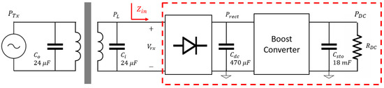 Figure 15 shows the input impedance seen by the inside coil. Impedance has an important effect in received voltage, rectifier efficiency and harvested power [35]. To measure received voltage, rectifier efficiency and harvested power, the outside transmitted power, , was fixed to 35 W at 2 kHz. The coil setup was the same for the rest of this paper, and the barrier is a 1 mm-thick aluminum plate. Additionally, the load on the inside subsystem was modified in the range of 10–1200 Ω to change equivalent input impedance . The impedance was calculated by measuring the voltage and current at the input of the full wave rectifier.