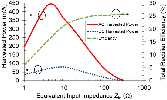 Figure 16 shows the harvested AC and DC power and total rectifier efficiency versus equivalent input impedance . When the equivalent input impedance is between 1–10 Ω, the harvested AC power ranges from 200–356 mW with a peak of 440 mW at 4 Ω. In the same impedance range, the total rectifier efficiency is between 6% to 21% due to the low received voltages, typically . As a result, the harvested DC power goes from 6 mW to a maximum of 75 mW at 10 Ω. Input impedance is the optimal value that provides a balance in rectifier efficiency and AC harvested power. When input impedance increases further, , the total rectifier efficiency increases to almost 25% while the AC harvested power degrades rapidly. Hence, when , the DC harvested power is reduced to 1 mW.
