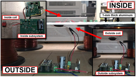 To validate our system, bidirectional communication was tested using the designed prototypes and a pair of coils. Each coil was located and aligned on each side of a 500 mm 500 mm 1 mm aluminum plate. The test setup is shown in Figure 18.