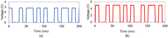 For further validation, a sample of inside to outside data transfer is presented in Figure 19. The transmit data corresponds to the digital output of the microcontroller of the inside subsystem, and the receive data is the demodulated data at the output of the outside subsystem. Communication is successful at a data rate of 100 bps using a 2 kHz carrier. A bit error rate analysis (BER) was calculated for the data transmission through metal using 360,000 bits during a time period of 60 min of data transmission. The results showed that the BER < for the wireless power transfer data link through metal.