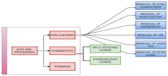 Pre-processing data are a vital role in the social media network concept analysis system. That is in sentiment analysis and latent semantic analysis of streaming data of Twitter. The text data available via Twitter are highly unstructured and noisy in nature. To achieve the best result, data preprocessing is required. The steps of data preprocessing are given in Figure 2.