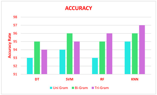 The performance evaluation of various ML algorithms such as DT, SVM, RF, and KNN algorithm on N-gram stacked autoencoder feature extraction obtains the accuracy illustrated in Figure 4.