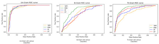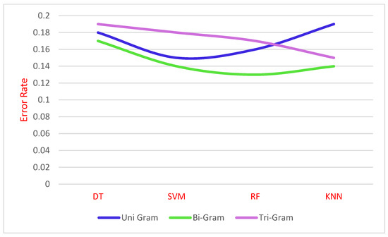 Figure 5 shows the error rate of classifiers DT, SVM, RF, and KNN with N-gram stacked autoencoder. The error rate is calculated by comparing the sending and received words. In this work, prediction is compared with the real opinion of the public. Figure 6 shows that ROC curve of the unigram, bigram, and trigram stacked autoencoders using four classifiers.