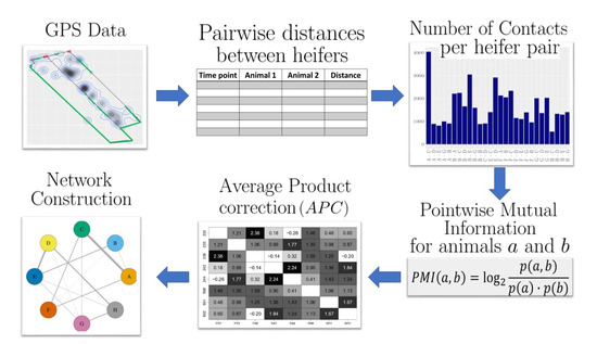 In order to measure the level of association (positive relationship) between the animals, we calculated the PMI between each pair of heifers. The PMI measures the probability of coincident occurrence of two variables (i.e., animals) with respect to the probability of independent occurrence [31]. The PMI [29,31,46] for two heifers a and b is calculated as: