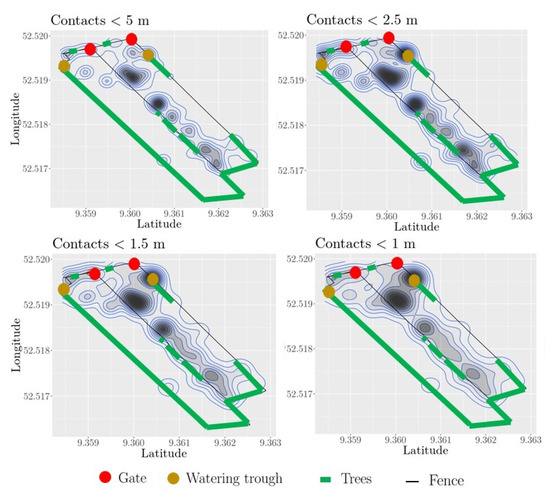 We further investigated the contact locations in the pasture to indicate to what extent these locations might change in response to different distance thresholds. The contact zones of the animals are depicted in Figure 3 and were spread through out the entire eastern part of the pasture, the newly opened pasture part. A clear contact zone was the eastern watering trough; this contact zone became apparent by decreasing the distance threshold. Other hot spots for contacts were the locations close to the middle fence, which separates the eastern and western pasture parts. The contact zones close to the middle fence were similarly located for the individual distance thresholds with some changes in their intensity that might be related to the different number of general contacts.