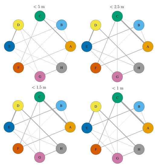 The number of contacts with respect to different distance thresholds (5 m, 2.5 m, 1.5 m, and 1 m) is shown in Figure 2. Despite the overall number of contacts decreasing with increasing distance threshold, the most obvious properties of the distributions remained, i.e., the heifer pair A–C had the largest number of contacts for all distance thresholds. It should be mentioned that the pairs B–C and B–E had nearly the same number of contacts using a distance threshold of 5 m, but the pair B–E showed much more contacts for all other distance thresholds. Applying a -test to determine whether there was a significant difference in the frequencies of contacts between each two distance thresholds, we found that except for the contact distributions 1 m and 1.5 m, all other combinations were significantly different ().