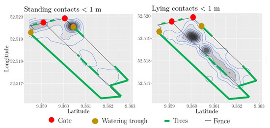 In order to investigate the different outcomes of social network construction based on animal activity, we separated the dataset into (i) both animals lying and (ii) both animals standing. For each of these two cases, we show the contact zones in Figure 5, choosing a distance threshold of 1 m. Contacts between standing animals were observed most frequently at the watering trough, as well as at the gate connecting the two pasture parts. Contacts between lying animals were most frequent in the north close to the middle fence, the area the animals used to lie down.
