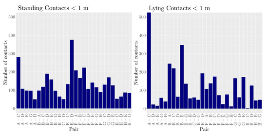 Second, we investigated the number of contacts between standing and lying animals. As shown in Figure 6, the general distribution of pairwise contacts differed between standing and lying animals (-test ). For the lying animals, the differences between the individual pairs were stronger compared to the standing heifers, and also, the top contact pairs differed between standing and lying. For the standing animals, the pair E–D showed the most contacts, whereas for lying, Animals A and C formed the strongest pair. Regarding the general contact frequencies between standing and lying heifers, there was no significant difference (Wilcoxon rank-sum test ).