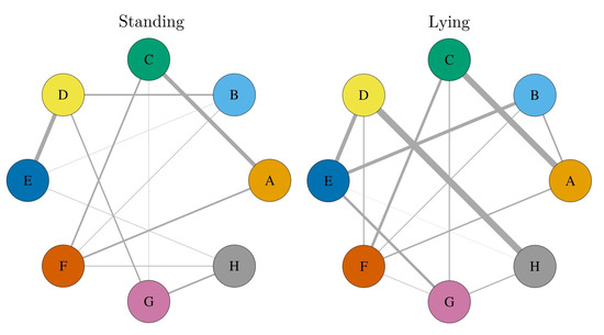 Based on these numbers of contacts, we constructed social networks for the lying and standing heifers, respectively, by using the described methodology. The networks are shown in Figure 7. Both networks included all eight heifers equipped with GPS tags. The network for standing heifers consisted of 13 social relations and the network of lying heifers of 14. Comparing both networks, nine links were consistent. Thus, for the standing network, four dyads were unique (B–D, D–G, B–H, F–H) and five for the lying network (A–B, D–F, E–G, F–G, D–H). The most striking difference between the networks was the connection between Heifers D and H, which was strongly represented in the lying network and not present in the network of standing heifers. A glimpse back to Figure 6 shows that this pair had the most contacts of lying animals for Heifer H. In contrast, it was even underrepresented among the standing animals.