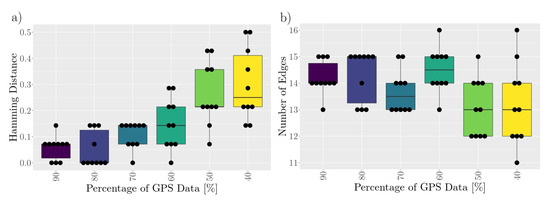 The results are presented in Figure 8. With inclining losses of data, the difference of the original from the networks of lost data increased. Considering networks constructed of 90% or 80% of the original data, the Hamming distance indicated only small differences between the networks and the original one regarding their edges. In fact, a Hamming distance of 0.14 indicated a difference affecting two edges. None of the networks constructed with 50% or 40% of the original dataset were equivalent to the original network. The observed maximum Hamming distance of 0.5 indicated a difference between the networks of seven edges (exchanged, newly present, absent).