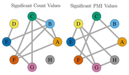 After PMI calculation, we transformed the values to PPMI to avoid negative values and applied the APC procedure to eliminate the background arising from pure chance contacts. Simplified, the APC procedure calculates for each matrix entry the mean of the corresponding column and row and subtracts this from the matrix entry. It is obvious in Figure A1 that most of the small entries were eliminated by the APC procedure and the larger values remained (red circles). However, the pairs B–C and F–G both had a PMI value of 1.06, but only the pair B–C was included in the network. This was due to the fact that most of the PMI values of C were low, and thus, its average was smaller compared to the other IDs, leading to a positive value after average subtraction.