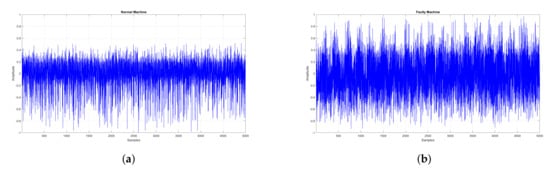 - Treat as the original signal and apply steps 1–6 to obtain other IMFs as follows:The decomposition process can be stopped when becomes a monotonic function. However, only few IMFs have physical meaning for most practical purposes. At the end of EMD, it gives a signal of the formwhere is decomposed into n IMFs and a residue . Figure 4a,b illustrate few IMFs extracted from normal and faulty signals of machines. High frequency components can be observed in lower IMFs. In this work, total 10 IMFs are extracted. It was conceived experimentally that first IMF (IMF1) contained noisy elements and redundant components. Therefore, this component was rejected. The remaining nine IMFs and residual signal were added together to construct the preprocessed signal.