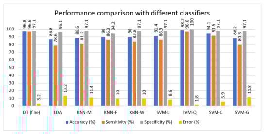 | Classifier | Accuracy (%) | Sensitivity (%) | Specificity (%) | Error (%) |