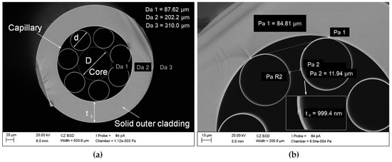 Scanning Electron Micrograph (SEM) cross-sectional image of the ARHCF: (a) view of the ARHCF with an air core of 87 µm and (b) view of the capillaries forming the fiber cladding.