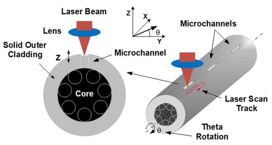 The method of fabricating the microchannels in the outer cladding of the fiber is shown in Figure 2. The developed laser micromachining process allows for non-contact and damage-free processing of the fragile fiber structure with the required high accuracy and precision. At the point of impact of a high-energy fs laser beam, the material evaporates, leading to the formation of a crater, the depth of which depends on the selected process parameters, i.e., pulse duration, repetition rate, scan speed, pulse energy, and the number of consecutive scans across the processed area. The key element of the method was the precise positioning of the fiber in such a way that the laser beam moved in the area between the inner capillaries, which in our case were 10–12 µm apart. For this reason, it was necessary to control the position of the fiber, which was realized using a CMOS (Complementary Metal-Oxide-Semiconductor) camera and precise motorized XYZ translation stages and theta rotation.