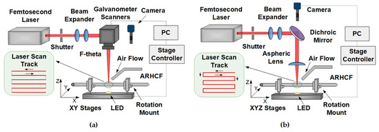 Schematic of the experimental setup for: (a) a system with galvanometer scanners and an F-theta lens and (b) a moving field and an aspherical lens.