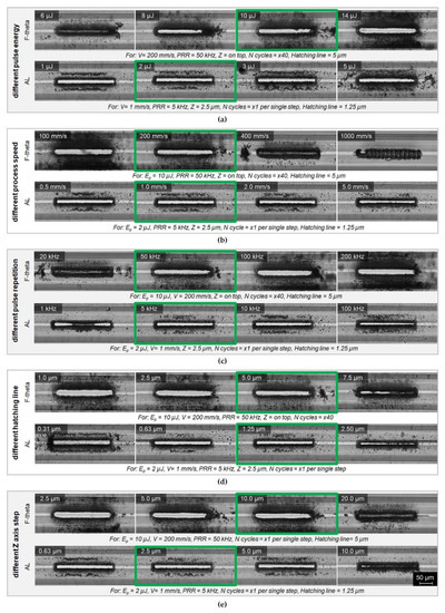 Microscope photographs of microchannels fabricated with the aid of a laser using a galvanometer scanner with an F-theta lens—F-theta and a setup based on a moving field and an aspherical lens, AL. Results are presented for varying parameters: (a) pulse energy, (b) scanning speed, (c) pulse repetition frequency, (d) different hatching lines, and (e) the Z-axis step of the beam focus position.