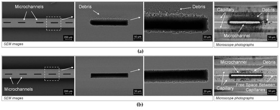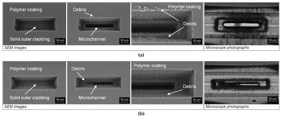 SEM images and microscope photographs of the polymer coating removal process and the laser microcutting of the microchannel realized in one process: (a) with the F-theta configuration and (b) with the AL configuration.