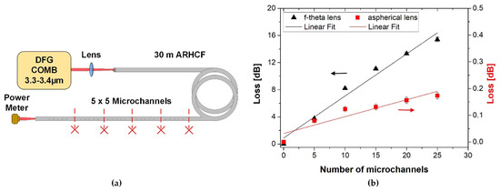 Influence of microchannel fabrication on transmission loss in the ARHCF for wavelengths 3.3–3.4 µm: (a) experimental setup and (b) loss measurement calculated as a function of the number of microchannels.